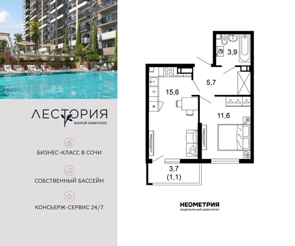 Продается квартира в жилом комплексе бизнес-класса «Лестория». В составе ЖК предусмотрена собственная аквазона площадью 473 квадратных метра с двумя подогреваемыми бассейнами, что соответствуют стандартам бизнес-класса.
