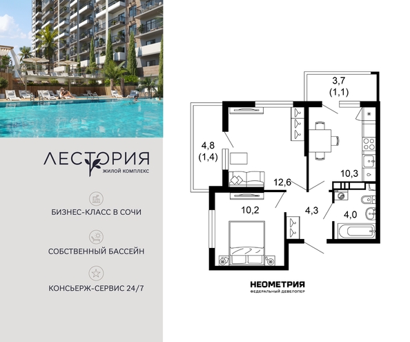 Продается квартира в жилом комплексе бизнес-класса «Лестория». В составе ЖК предусмотрена собственная аквазона площадью 473 квадратных метра с двумя подогреваемыми бассейнами, что соответствуют стандартам бизнес-класса.
