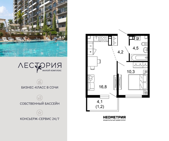 Продается квартира в жилом комплексе бизнес-класса «Лестория». В составе ЖК предусмотрена собственная аквазона площадью 473 квадратных метра с двумя подогреваемыми бассейнами, что соответствуют стандартам бизнес-класса.