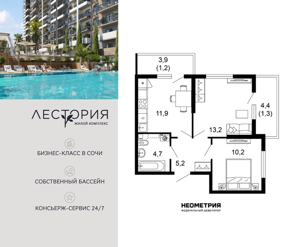 Продается квартира в жилом комплексе бизнес-класса «Лестория». В составе ЖК предусмотрена собственная аквазона площадью 473 квадратных метра с двумя подогреваемыми бассейнами, что соответствуют стандартам бизнес-класса.