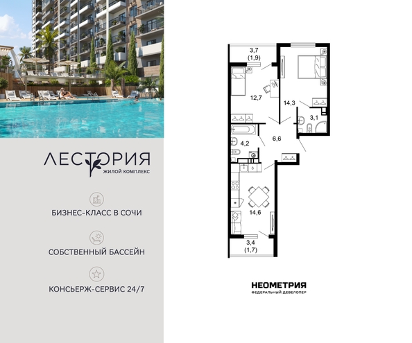 Продается квартира в жилом комплексе бизнес-класса «Лестория». В составе ЖК предусмотрена собственная аквазона площадью 473 квадратных метра с двумя подогреваемыми бассейнами, что соответствуют стандартам бизнес-класса.