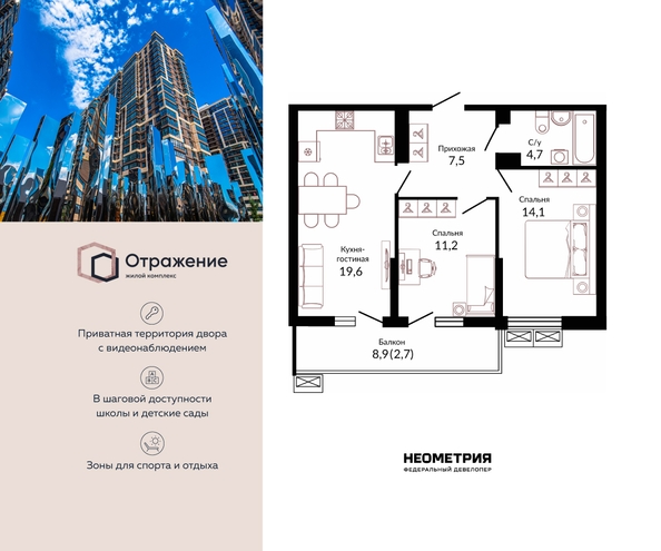 Продается квартира в жилом комплексе «Отражение». Это новый стандарт комфортного проживания от федерального девелопера «Неометрия».