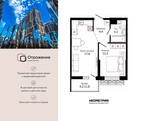 Продается квартира в жилом комплексе «Отражение». Это новый стандарт комфортного проживания от федерального девелопера «Неометрия».