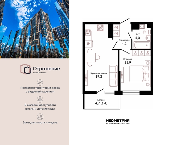 Продается квартира в жилом комплексе «Отражение». Это новый стандарт комфортного проживания от федерального девелопера «Неометрия».