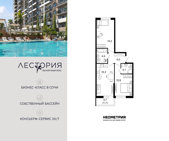 Продается квартира в жилом комплексе бизнес-класса «Лестория». В составе ЖК предусмотрена собственная аквазона площадью 473 квадратных метра с двумя подогреваемыми бассейнами, что соответствуют стандартам бизнес-класса.