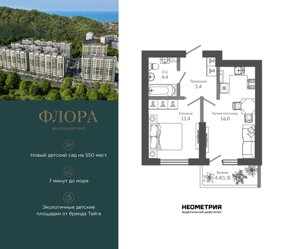 Продается квартира в ЖК «Флора» от федерального девелопера «Неометрия». Это жилой комплекс комфорт-класса в самом зеленом районе Сочи. При проектировании постарались максимально сохранить окружающую флору и фауну. Теплое море, горы, целебные источники, река, близость заповедника – все это уже рядом с вами.
