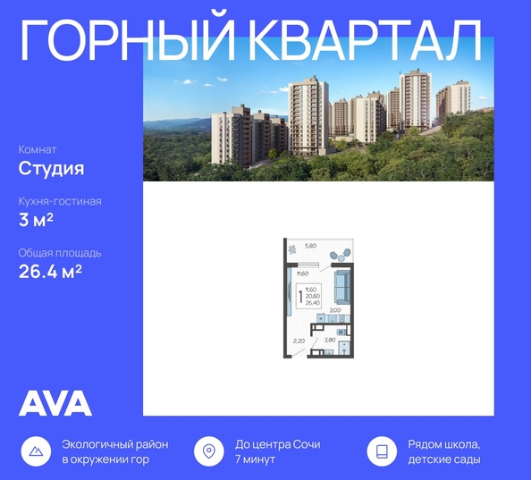 <p>Продается студия в доме (Литер 3), срок сдачи : 3 кв. 2026, общей площадью 26.4 кв.м., на 10 этаже в новом современном жилом комплексе в Сочи «Горный квартал», Хостинский район. Отличный вариант для инвестиций и жизни.</p>