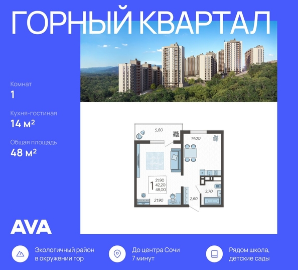 <p>Продается 1-комнатная квартира в доме (Литер 6), срок сдачи : 3 кв. 2026, общей площадью 48 кв.м., на 14 этаже в новом современном жилом комплексе в Сочи «Горный квартал», Хостинский район. Отличный вариант для инвестиций и жизни.</p>