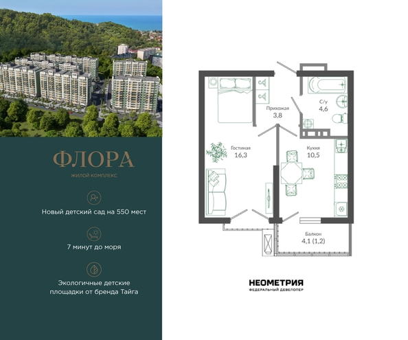 Продается квартира в ЖК «Флора» от федерального девелопера «Неометрия». Это жилой комплекс комфорт-класса в самом зеленом районе Сочи. При проектировании постарались максимально сохранить окружающую флору и фауну. Теплое море, горы, целебные источники, река, близость заповедника – все это уже рядом с вами.