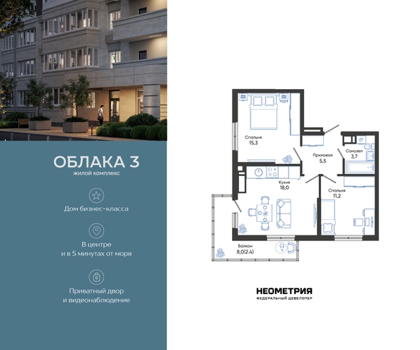 Продается квартира в жилом комплексе «Облака» от федерального девелопера «Неометрия».