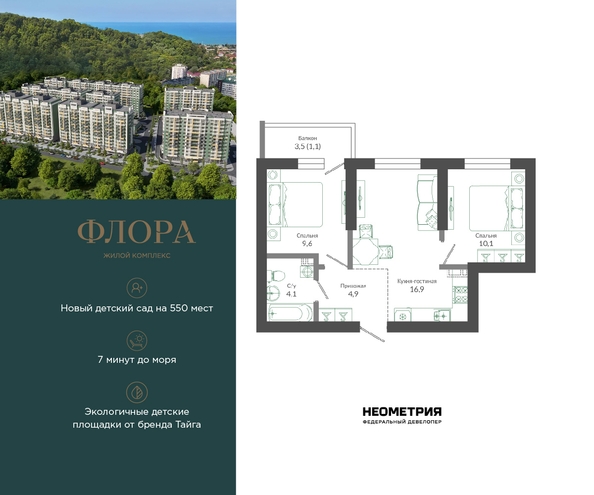 Продается квартира в ЖК «Флора» от федерального девелопера «Неометрия». Это жилой комплекс комфорт-класса в самом зеленом районе Сочи. При проектировании постарались максимально сохранить окружающую флору и фауну. Теплое море, горы, целебные источники, река, близость заповедника – все это уже рядом с вами.