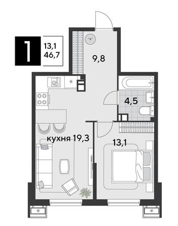 Срок сдачи: 4 кв. 2025, общей площадью 46.7 кв.м., на 8 этаже.
