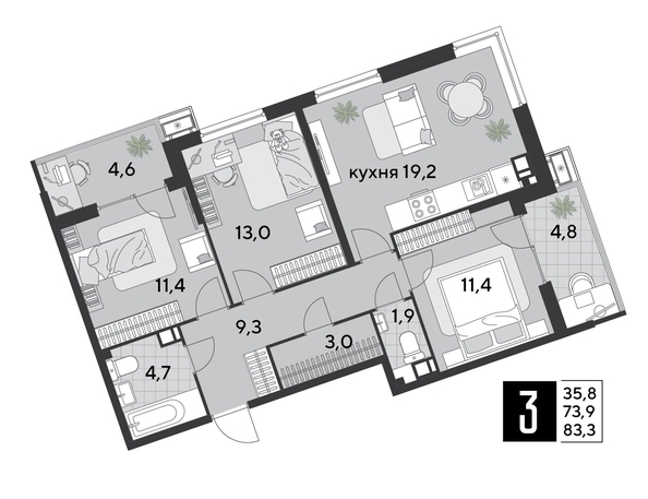 Срок сдачи: 4 кв. 2025, общей площадью 83.3 кв.м., на 7 этаже.