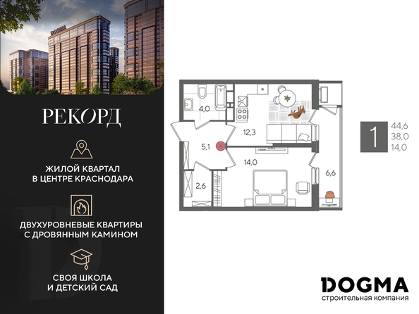 В продаже 1-комнатная квартира от застройщика! ЖК «Рекорд» 2 очередь, г. Краснодар, Литер 5 Срок сдачи: 4 кв. 2026, общей площадью 44.6 кв.м., на 23 этаже.