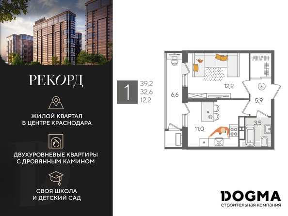 В продаже 1-комнатная квартира от застройщика! ЖК «Рекорд» 2 очередь, г. Краснодар, Литер 5 Срок сдачи: 4 кв. 2026, общей площадью 39.2 кв.м., на 23 этаже.