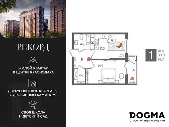 В продаже 1-комнатная квартира от застройщика! ЖК «Рекорд» 2 очередь, г. Краснодар, Литер 5 Срок сдачи: 4 кв. 2026, общей площадью 41.6 кв.м., на 21 этаже.