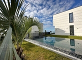 Великолепное архитектурное решение исполнено в самых лучших традициях хай-тека, который характеризуется строгой геометрией фасадных линий, большой площадью витражного остекления. Прекрасным дополнением к архитектурному обличаю служит красивый ландшафтный дизайн прилегающей к дому территории. Участок перед домом украшен пальмами, рододендронами, оснащен автополивом и контурной подсветкой. Площадь участка -5 соток. Площадь дома -220 квадратных метров. Кухня-гостиная, две мастер спальни, одна гостевая спальня, кабинет, три санузла. Конструкция коттеджа - монолитная.