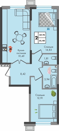 2-комнатная квартира с большой кухней-гостиной в жилом комплексе “Зеленая территория” от надежного застройщика СЗ “Флагман” в Краснодаре.