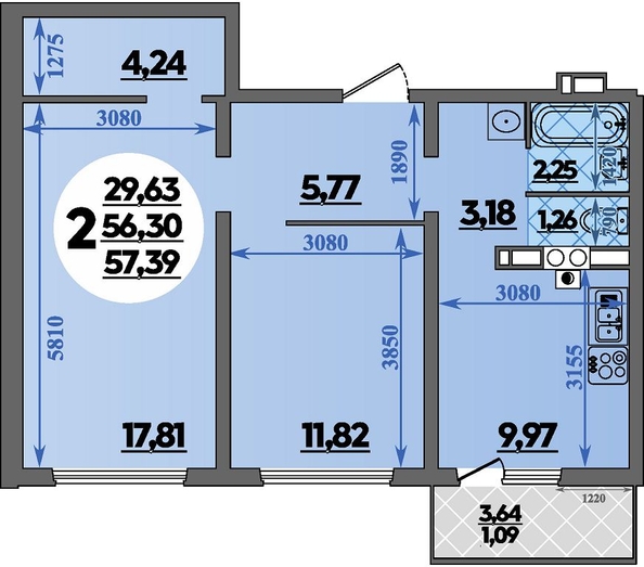 Общая площадь квартиры — 57.39 кв.м. Тип дома — панельный. Компания-застройщик — ВКБ-Новостройки.