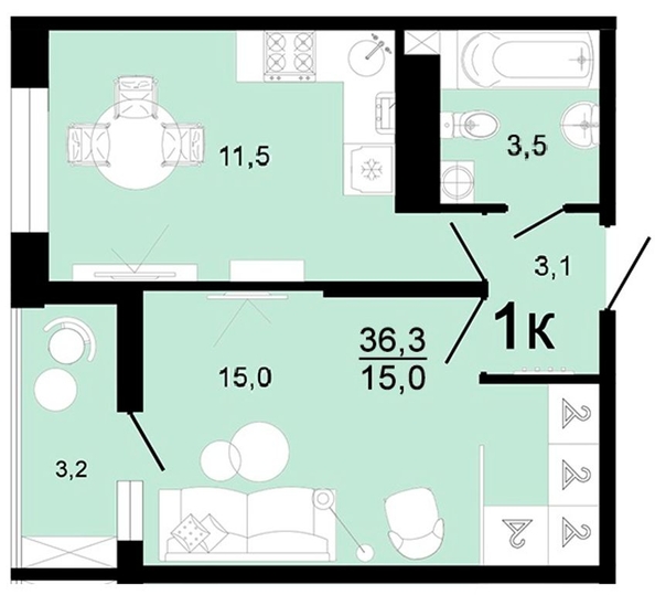 Жилая площадь: 15 кв.м, кухня - 11.5 кв.м. предчистовая отделка. , окна выходят на улицу.