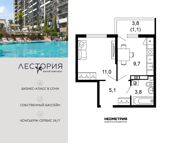 Продается квартира в жилом комплексе бизнес-класса «Лестория». В составе ЖК предусмотрена собственная аквазона площадью 473 квадратных метра с двумя подогреваемыми бассейнами, что соответствуют стандартам бизнес-класса.