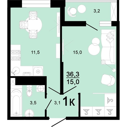 Жилая площадь: 15 кв.м, кухня - 11.5 кв.м. предчистовая отделка. , окна выходят на улицу.