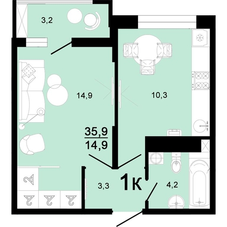Жилая площадь: 14.9 кв.м, кухня - 10.7 кв.м. предчистовая отделка. , окна выходят на улицу.