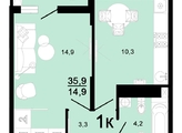 Продажа от застройщика 1 - комнатная квартира, общей площадью 35.9 кв.м.