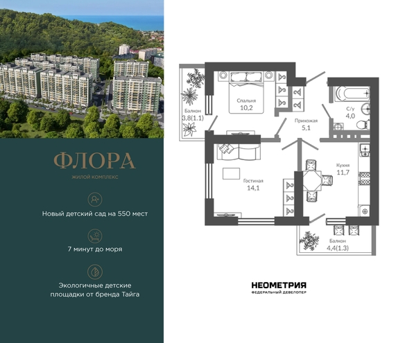 Продается квартира в ЖК «Флора» от федерального девелопера «Неометрия». Это жилой комплекс комфорт-класса в самом зеленом районе Сочи. При проектировании постарались максимально сохранить окружающую флору и фауну. Теплое море, горы, целебные источники, река, близость заповедника – все это уже рядом с вами.