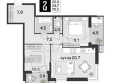 Срок сдачи: 1 кв. 2026, общей площадью 72.3 кв.м., на 2 этаже.
