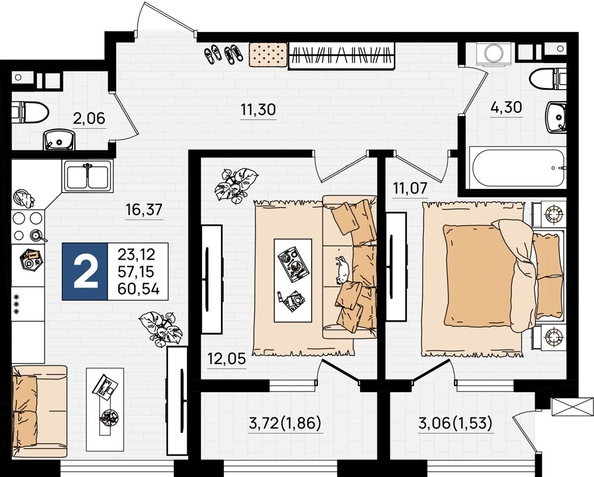 Общая площадь квартиры — 60.54 кв.м. Тип дома — монолит-кирпич. Компания-застройщик — ССК.