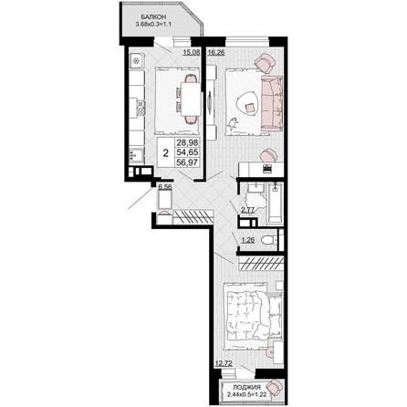 Общая площадь квартиры — 56.97 кв.м. Тип дома — монолит-кирпич. Компания-застройщик — ССК.