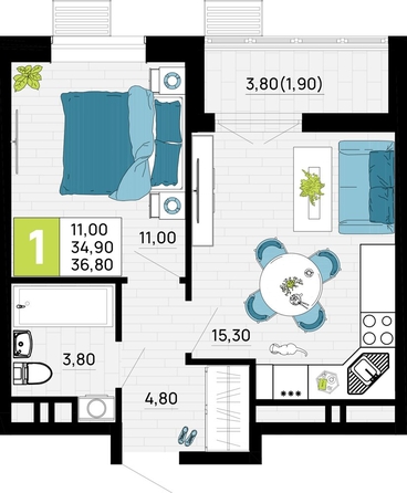 Общая площадь квартиры — 36.8 кв.м. Тип дома — монолит-кирпич. Компания-застройщик — ССК.
