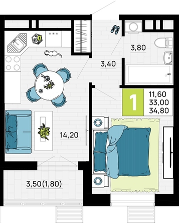 Общая площадь квартиры — 34.8 кв.м. Тип дома — монолит-кирпич. Компания-застройщик — ССК.