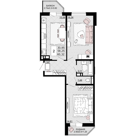 Общая площадь квартиры — 60.32 кв.м. Тип дома — монолит-кирпич. Компания-застройщик — ССК.