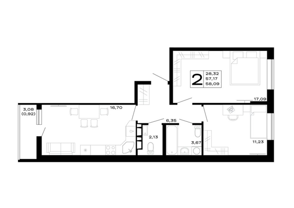 Общая площадь квартиры — 58.09 кв.м. Тип дома — монолит-кирпич. Компания-застройщик — ССК.