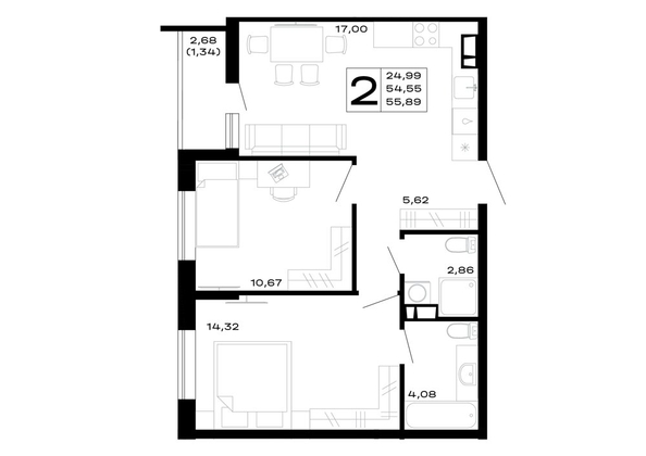 Общая площадь квартиры — 55.89 кв.м. Тип дома — монолит-кирпич. Компания-застройщик — ССК.