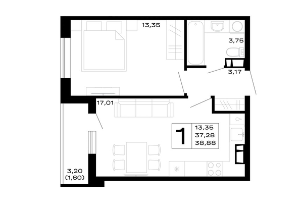 Общая площадь квартиры — 38.88 кв.м. Тип дома — монолит-кирпич. Компания-застройщик — ССК.