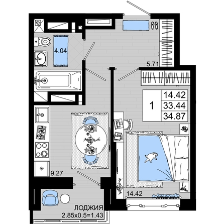 Общая площадь квартиры — 34.87 кв.м. Тип дома — монолит-кирпич. Компания-застройщик — ССК.