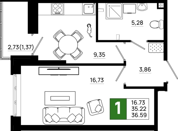Общая площадь квартиры — 36.59 кв.м. Тип дома — монолит-кирпич. Компания-застройщик — ССК.