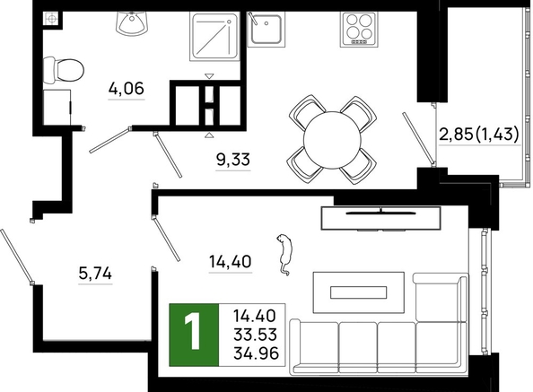 Общая площадь квартиры — 34.96 кв.м. Тип дома — монолит-кирпич. Компания-застройщик — ССК.