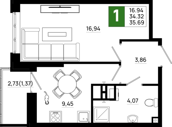 Общая площадь квартиры — 35.69 кв.м. Тип дома — монолит-кирпич. Компания-застройщик — ССК.
