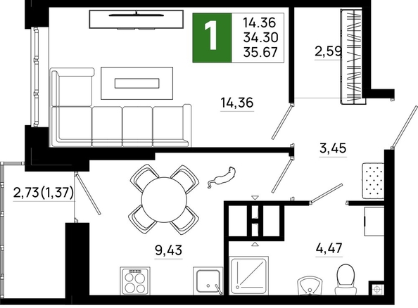 Общая площадь квартиры — 35.67 кв.м. Тип дома — монолит-кирпич. Компания-застройщик — ССК.