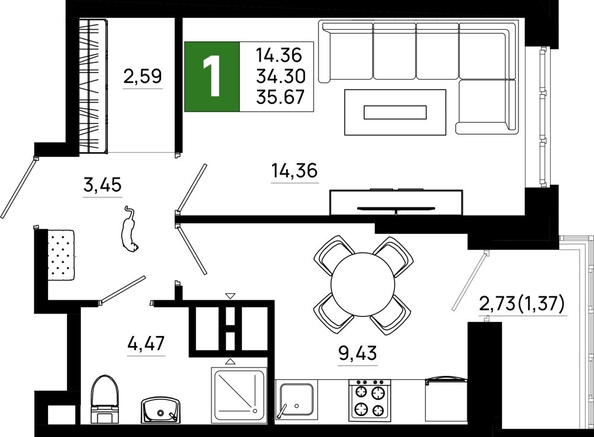 Общая площадь квартиры — 35.67 кв.м. Тип дома — монолит-кирпич. Компания-застройщик — ССК.