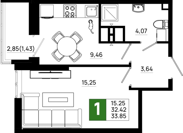 Общая площадь квартиры — 33.85 кв.м. Тип дома — монолит-кирпич. Компания-застройщик — ССК.