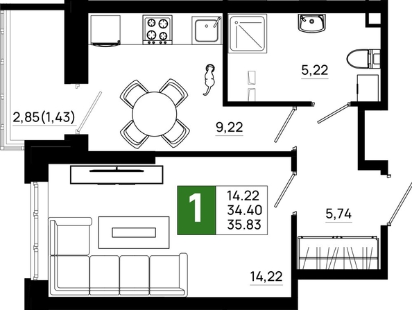 Общая площадь квартиры — 35.83 кв.м. Тип дома — монолит-кирпич. Компания-застройщик — ССК.