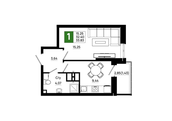 Общая площадь квартиры — 33.83 кв.м. Тип дома — монолит-кирпич. Компания-застройщик — ССК.