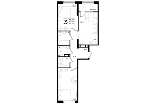 Общая площадь квартиры — 64.4 кв.м. Компания-застройщик — ССК.