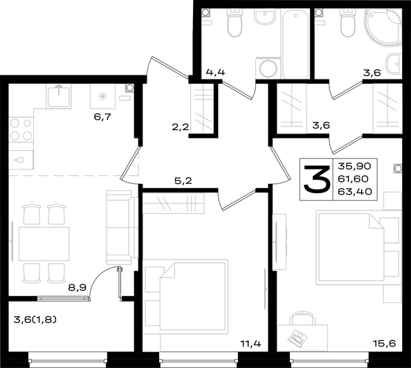 Общая площадь квартиры — 63.4 кв.м. Тип дома — монолит-блок. Компания-застройщик — ССК.