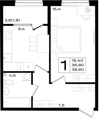 Общая площадь квартиры — 38.6 кв.м. Компания-застройщик — ССК.